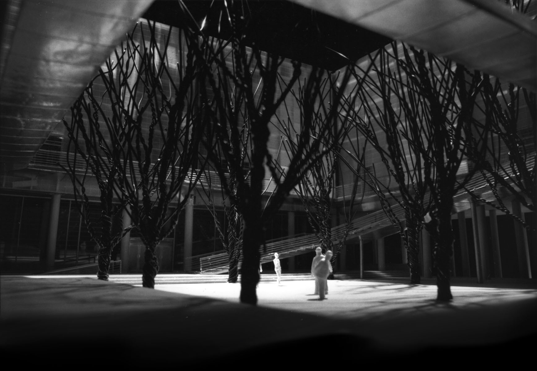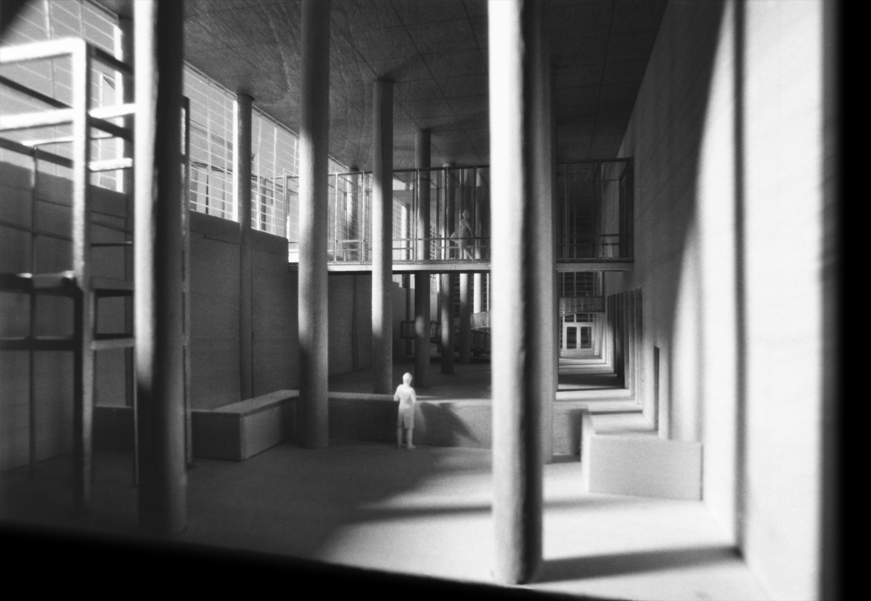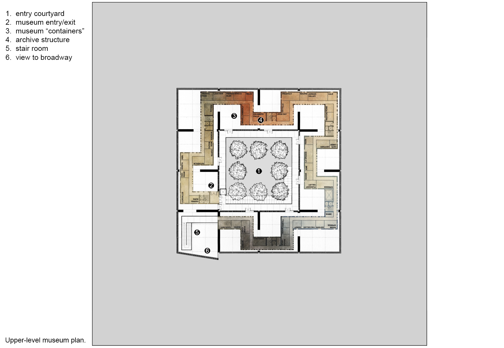 The architecture of the building is designed to reinforce an experience of separation-then-reconnection. Visitors are first brought from the street to an internal courtyard, buffered from the surrounding city. Using street-level grade as a metaphor for the here-and-now, visitors then depart their contemporary lives, either ascending to the elevated museum or descending to the below-grade library. Further extending the separation metaphor, the museum is housed within twelve abstract metallic cubes. Light and exterior views are screened, withholding direct perception of the world outside. Within these rooms passes a separate structure which houses the archive. Constructed of rammed earth from the soil of the Oregon Country’s various regions, the archive’s tactility attracts and connects as the metallic container repulses and separates. The visitor is free to circulates up, onto, and through the archive structure as desired. The last room is empty. The archive becomes a stair which begins the return to current time: as Oregonians are collected back to the museum floor they are presented with the only direct exterior view, back down busy Broadway St as a reminder of the here-and-now.