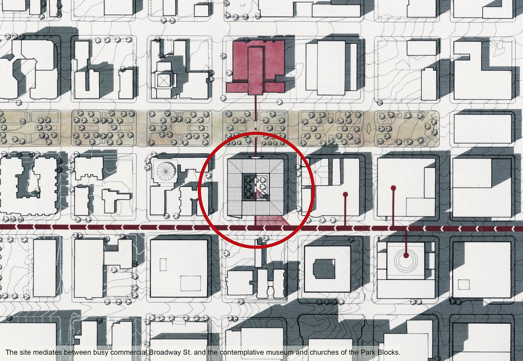 The architecture of the building is designed to reinforce the experience of separation from the here-and-now and facilitate the connection with historical time. The building is entered via an internal courtyard at street-level, buffered from the surrounding city. Using street-level grade as a metaphor for the here-and-now, visitors depart their contemporary lives, either ascending to the museum or descending to the below-grade library. Extending the separation metaphor, the museum is housed within twelve abstract metallic cubes. Light and air are permitted to enter, but direct exterior views are withheld. Within these rooms passes a structure which houses the archive. Constructed of rammed earth from the soil of the Oregon Country’s various regions, the archive’s tactility attracts and connects as the metallic container repulses and separates. The visitor circulates up, onto, and through the archive structure as desired. Those who follow to its end find the last room empty. The archive becomes a stair which begins the return to current time: as Oregonians are collected back to the museum floor they are presented with the only direct exterior view, back down busy Broadway St, as a reminder of the here-and-now.