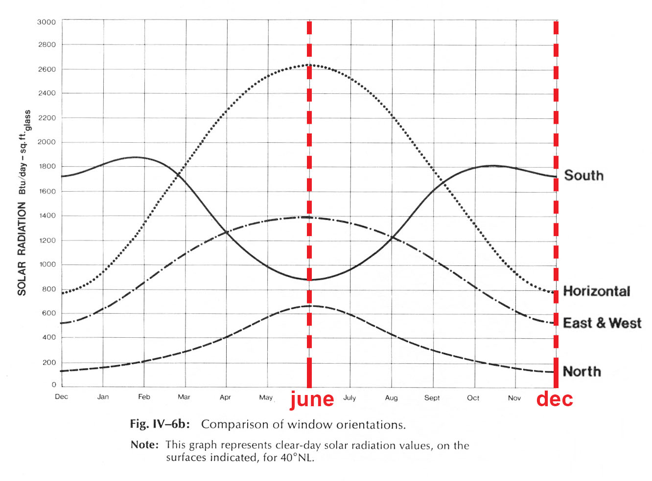 Because of the sun’s changing path, the solar radiation received by different building surfaces is not all the same. In North America, the summer sun comes up far around towards the North, rises high overhead, and sets far around past West. In the winter it rises far to the South, climbs only partway up the southern sky, and then drops below the horizon before making it to West. As a result, the solar radiation received by the North, South, East/West, and roof surfaces of a building varies dramatically between orientations and from season to season. These variations are neatly encapsulated in the chart below (taken from Mazria’s Passive Solar Energy Book):