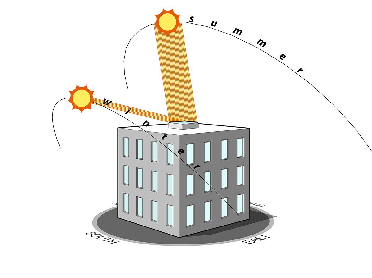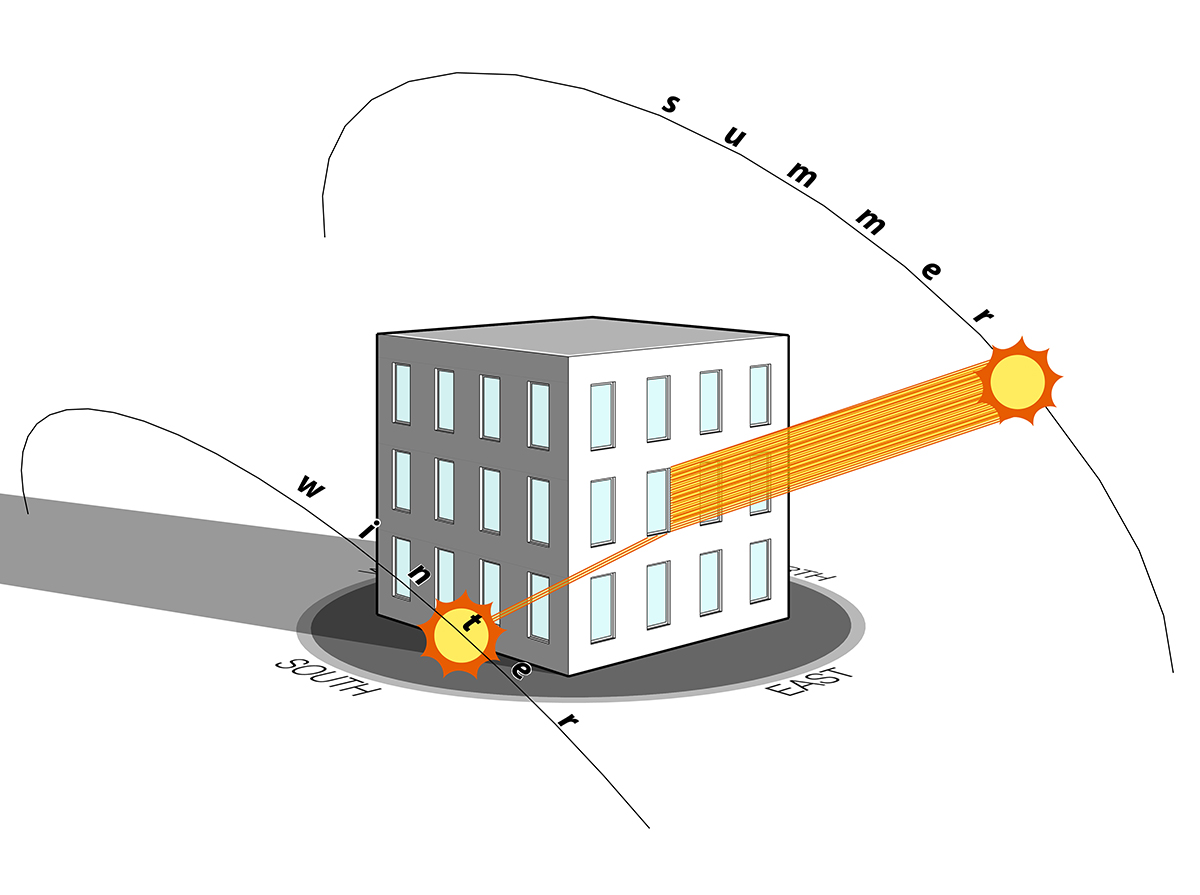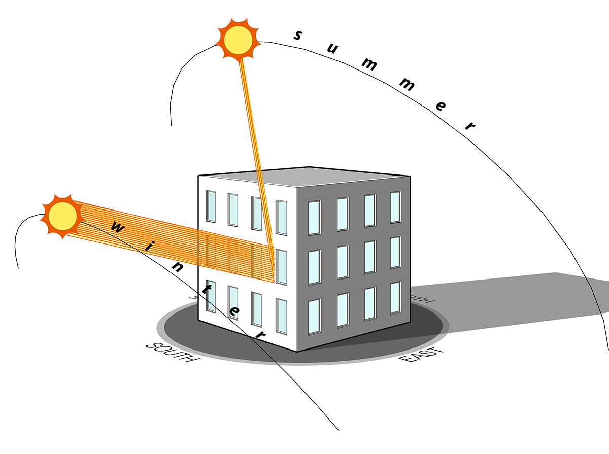 Understanding the path of the sun is ancient and fundamental… and a lost art in contemporary construction. Even a rudimentary understanding of where the sun falls on a building at different times of the year can significantly improve its performance: reduced heating and cooling needs, reduced electric lighting, better daylight, more comfortable spaces, a more desirable interior environment.